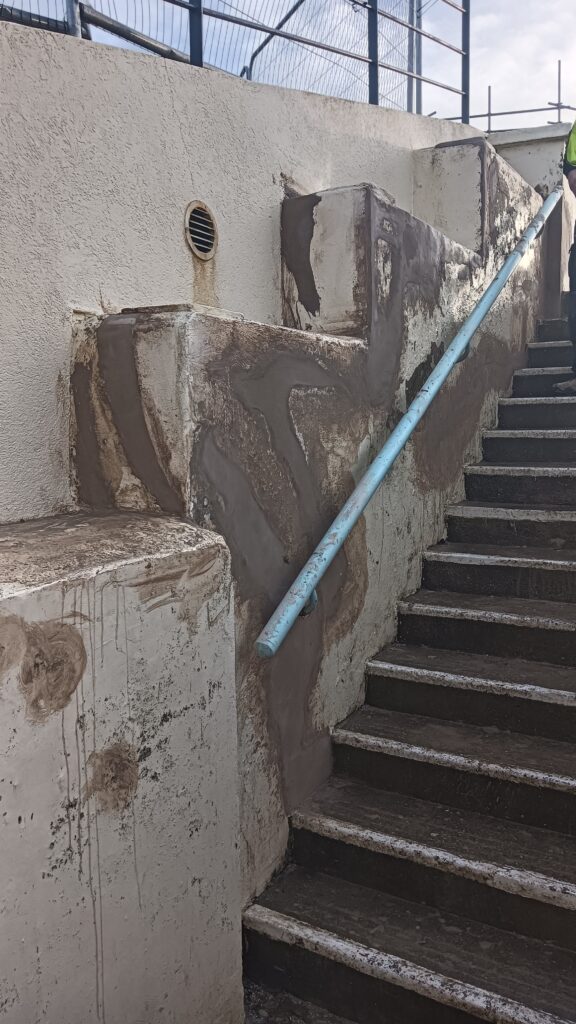 In December, DBR will start on filling every hole created. This will allow the render to set over the Christmas period before decoration in early 2026. A large gap has been found within the concrete balustrade and movement has occurred, this area will be pinned back into place before rendering into the gap.
