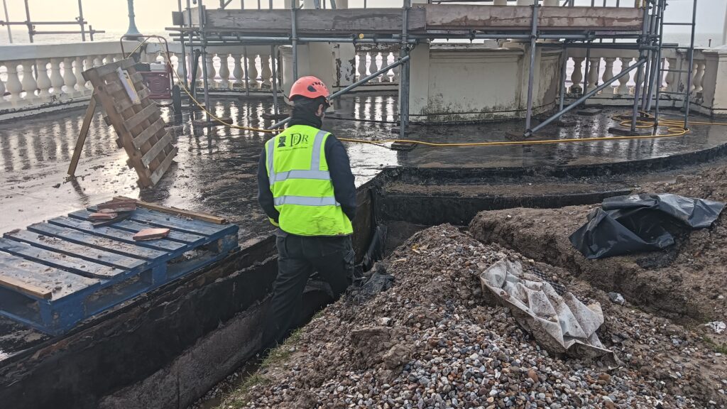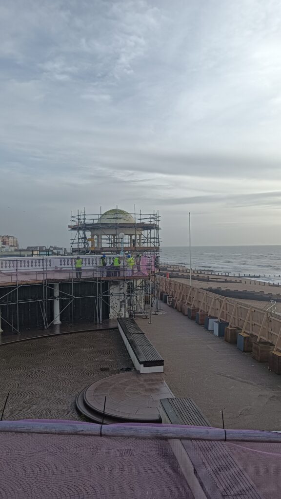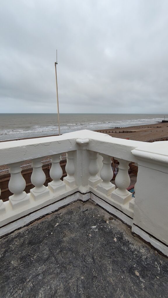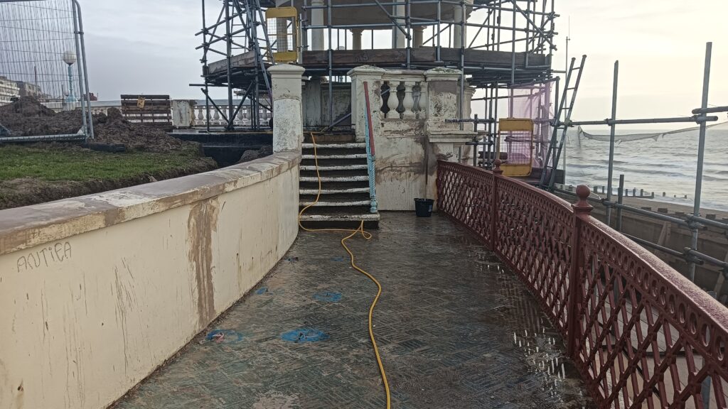 November saw works start in earnest through our contractor DBR. One of the first items worked on was the removal of the tiles on the balconies at either side of the Colonnade. The tiles are seen all over East Sussex often in residential dwellings and are representative of the materials used when the Colonnade was built.