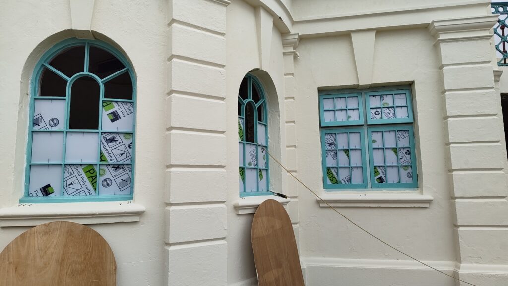 - Balustrade decoration tests have begun. This is made up of three layers – a grey filler to cover the final holes and blemishes, a white undercoat with a sand content that fills the smallest of gaps, then 2 layers of heritage approved breathable paint to match to the original cream colour of the render.