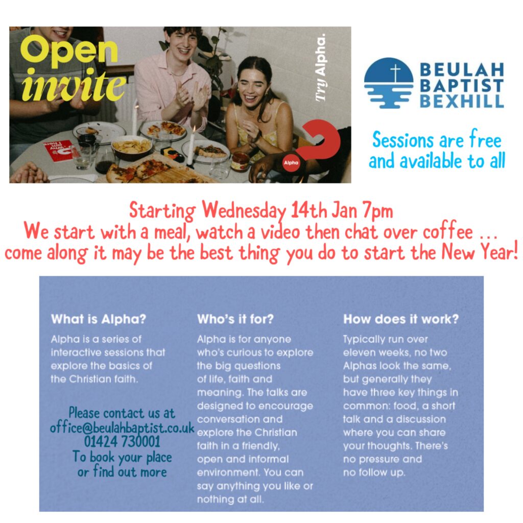 Starting on Wednesday 14th Jan at 7pm Beulah Baptist Church are running a 10 week Alpha course. Sessions are free.